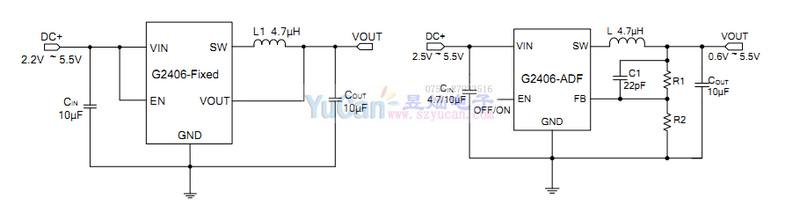 G2406是高效同步PWM降壓型DC/DC轉(zhuǎn)換器,工作電壓范圍為2.2V至5.5V G2406適用于單節(jié)鋰電池供電應(yīng)用。